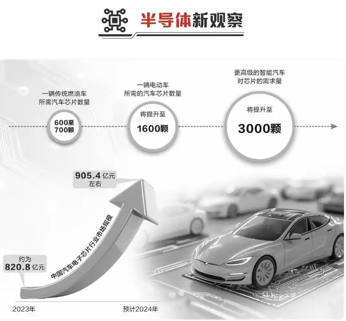 來自中汽協(xié)數(shù)據(jù)顯示,2024年中國新能源(600617)汽車銷量達(dá)到1286.6萬輛,同比增長35.5%。相比燃油車,新能源車所需的半導(dǎo)體用量成倍增加。與此同時,中國新能源汽車的智能化水平也在持續(xù)攀升,這些均對汽車智能芯片有著廣泛需求。據(jù)該協(xié)會此前公布的數(shù)據(jù),一輛傳統(tǒng)燃油車所需汽車芯片數(shù)量為600—700顆,一輛電動車所需的汽車芯片數(shù)量將提升至1600顆,而更高級的智能汽車對芯片的需求量將提升至3000顆。