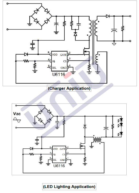 •產(chǎn)品描述:U6116是一款高性能初級側(cè)調(diào)節(jié)(PSR)控制器,具有高精度CV/CC控制,是充電器應(yīng)用的理想選擇。如果SEL引腳短于GND,該IC還可以支持LED照明的準(zhǔn)諧振(QR)降壓恒流拓?fù)洹T贑V模式下,U6116采用AM(幅度調(diào)制)模式和動態(tài)響應(yīng)的混合多模式控制。內(nèi)置的電纜跌落補償(CDC)功能可以提供出色的CV性能。U6116集成了調(diào)頻模式的功能和保護,提高了系統(tǒng)的效率和可靠性。CC模式。集成電路采用帶線路和負(fù)載CC補償?shù)腜FM控制。該IC可以實現(xiàn)無音頻噪聲運行和優(yōu)化的電壓鎖定(UVLO)、VDD過壓保護(VDD OVP)、逐周限流(OCP)、短負(fù)載保護(SLP)、門箝位和VDD箝位。