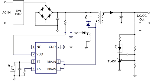 •主要特點:數字頻率變換技術,提高EMI性能。固定65kHz PWM開關頻率。電流感測前沿消隱。內部同步坡度補償。低待機功耗(<75mW@AC230V);上電時軟啟動,降低MOSFET Vds應力;全面保護功能:VCC欠壓鎖滯(UVLO)。VCC的過電壓保護(OVP)。逐周期電流限制。過載保護(OLP)。過熱保護(OTP)。電流限制補償,在通用交流線路輸入中獲得相同的輸出電流。低啟動電流(<10uA@VCC=12V);封裝:DIP-7