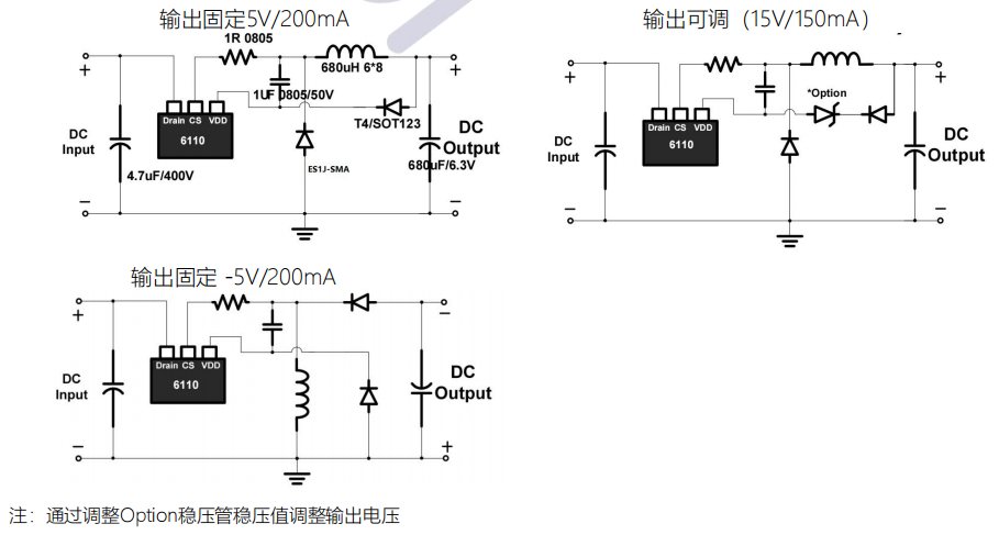 U6110是一款非隔離型、高集成度且低成本的PWM功率開關,適用于降壓型和升降壓型電路。U6110采用高壓單晶圓工藝,在同一片晶圓上集成有600V高壓MOSFET和采用開關式峰值電流模式控制的控制器。在全電壓輸入的范圍內可以保證高精度的5V默認輸出。在芯片內部,振蕩器頻率固定為31kHz且帶有抖頻功能,在保證輸出功率的條件下優化了EMI效果。同時,芯片設計有輕重載模式,可輕松獲得低于50mW的待機功耗。U6110集成有完備的保護功能:VDD欠壓保護、逐周期電流限制、過熱保護、過載保護和短路保護等。