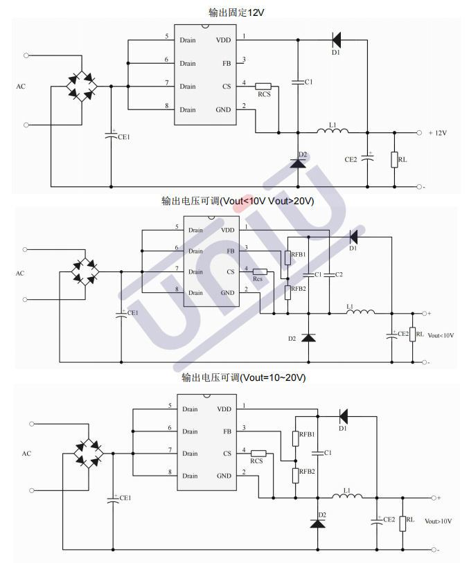 •主要特點:集成 500V 高壓啟動電路;多模式控制、無異音工作;支持降壓和升降壓拓撲;默認 12V 輸出( FB 腳懸空);待機功耗低于 50mW;良好的線性調整率和負載調整率;集成軟啟動電路;內部保護功能 :過載保護 (OLP);逐周期電流限制 (OCP);輸出過壓保護 (OVP);VDD 過壓、欠壓和電壓箝位保護