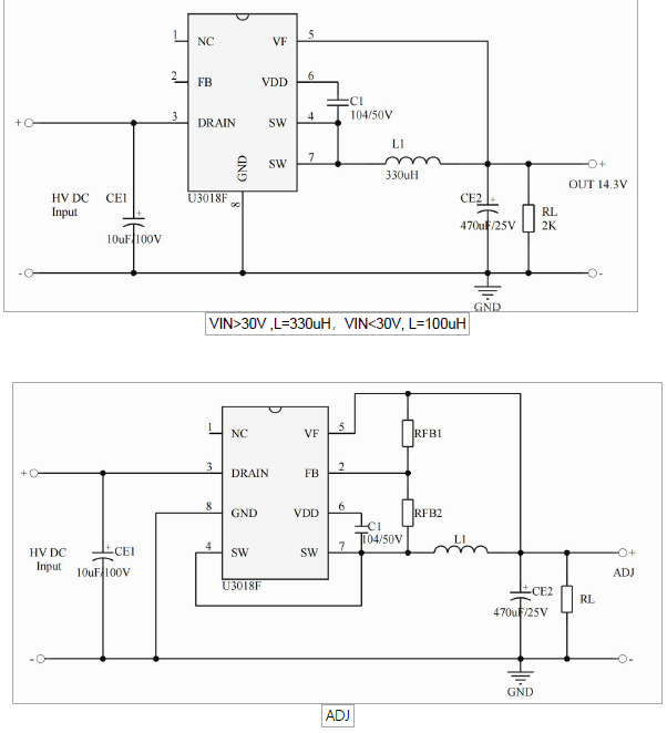 •主要特點:VIN: 18~180V(OUT: 14.3V);集成 2.5A 180V MOS;集成 200V 高壓啟動電路;集成續流二極管;多模式控制、無異音工作;支持降壓和升降壓拓撲;默認14.3V 輸出;待機功耗低于 50mw;良好的線性調整率和負載調整率;集成軟啟動電路;內部保護功能:過載保護 (OLP);逐周期電流限制(OCP);輸出過壓保護(OVP);VDD 過壓、欠壓和電壓箝位保護