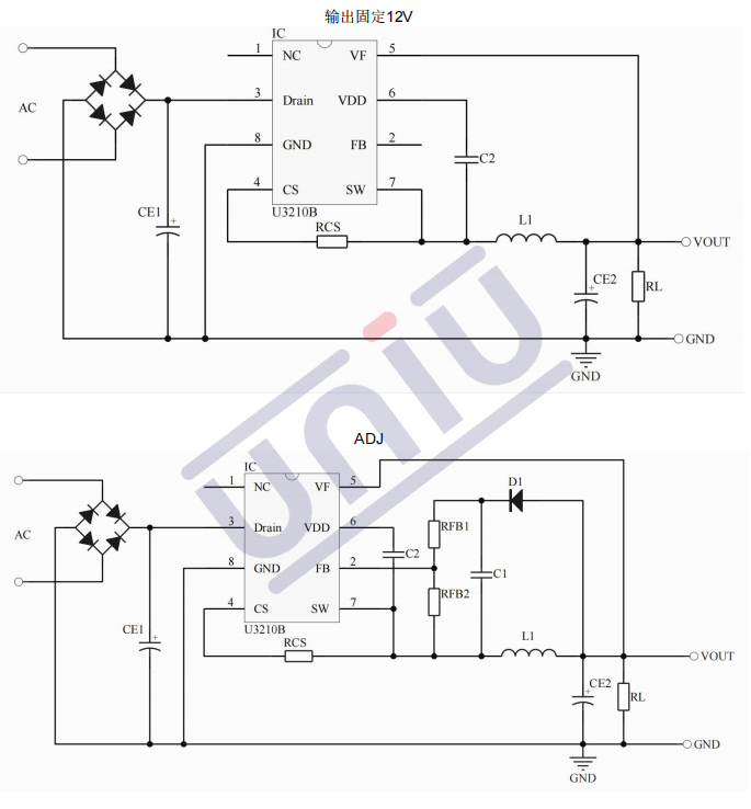 •主要特點:集成9Ω,500V MOS ; 集成500V 高壓啟動電路 ; 集成續流二極管 ; 多模式控制、無異音工作 ; 支持降壓和升降壓拓撲 ; 默認12V 輸出( FB 腳懸空) ; 待機功耗低于50mW ; 良好的線性調整率和負載調整率 ; 集成軟啟動電路 ; 內部保護功能:過載保護 (OLP) 、 逐周期電流限制 (OCP) 、 輸出過壓保護 (OVP) 、 VDD 過壓、欠壓和電壓箝位保護