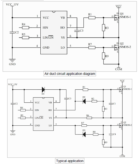 •主要特點:集成自舉二極管;為自舉操作設計的浮動通道;完全工作到+600V;容忍負瞬態電壓;v /dt免疫;柵極驅動供電范圍從4.8到20v;欠壓鎖定;3.3V, 5V和15V輸入邏輯兼容;交叉導阻邏輯