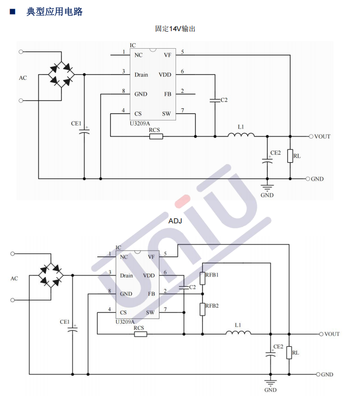 U3209A是一款高性能低成本PWM控制功率器, 適用于離線式小功率降壓型應用場合,外圍電路簡單、 器件個數少。同時產品啟動模塊內置高耐壓(500V) MOSFET可提高系統浪涌耐受能力。 與傳統的 PWM 功率開關不同,U3209A內部無 固定時鐘驅動 MOSFET ,系統開關頻率隨負載變化 可實現自動調節。同時芯片采用了多模式PWM控制 技術,有效簡化了外圍電路設計,提升線性調整率和 負載調整率并消除系統工作中的可聞噪音。此外,芯 片內部峰值電流檢測閾值可跟隨實際負載情況自動調 節,可以有效降低空載情況下的待機功耗。 U3209A集成有完備的帶自恢復功能的保護功能: VDD 欠壓保護、逐周期電流限制、輸出過壓保護、 過熱保護、過載保護和 VDD 過壓保護。